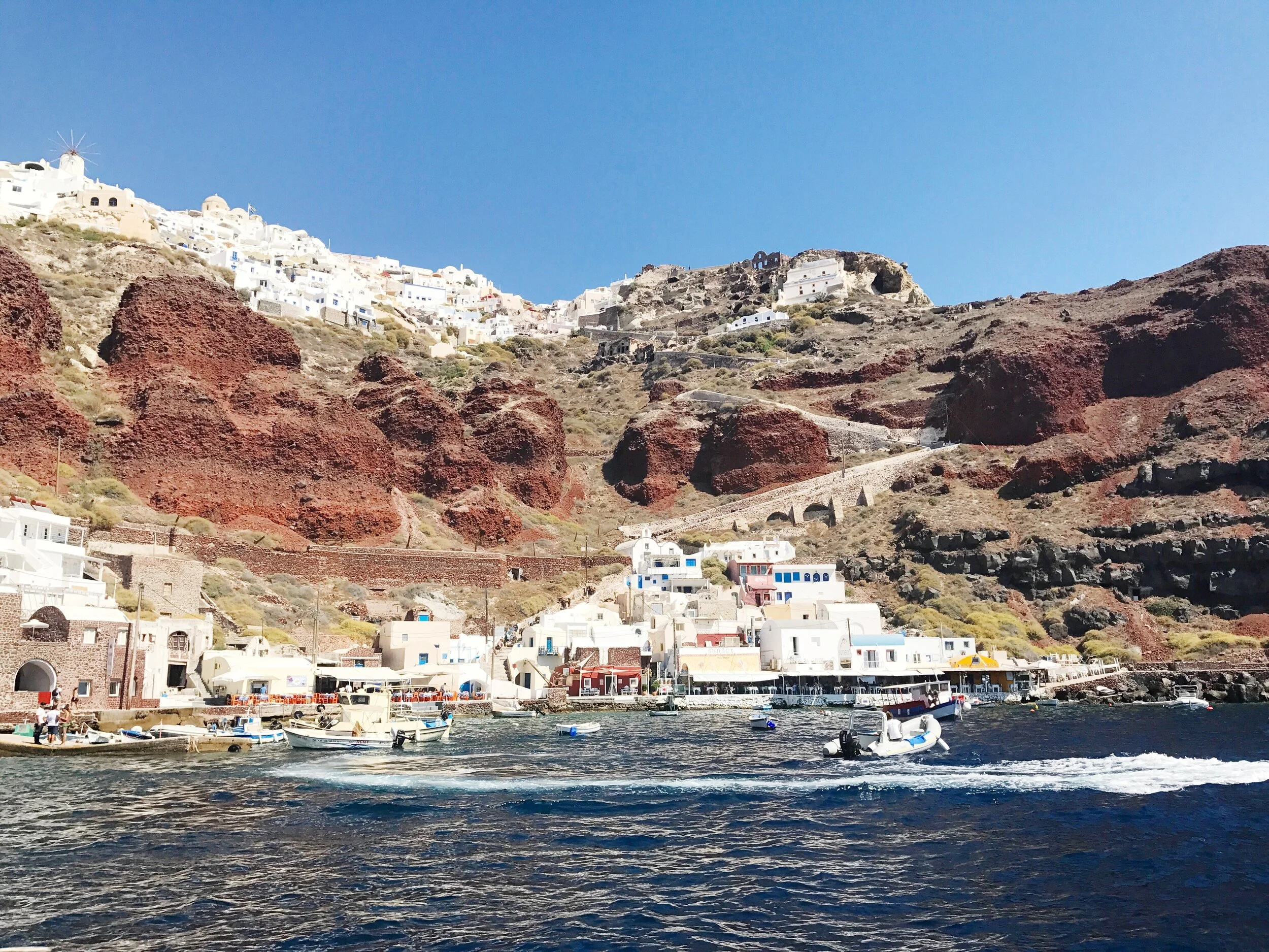 As previously stated, we stayed in a town called Imerovigli. A SUPER calm and relaxing town. This place is more for people that want to lounge, to relax. I loved it! It was centrally located between the two big towns, Fira and Oia. About Oia: this is the two that is known for its luxurious shops and high-end hotels. It is very touristy driven and the sidewalks are brimming with people walking around. This is where you have all the shops and bars and restaurants. I loved this place to hang out for the day- not to stay in.